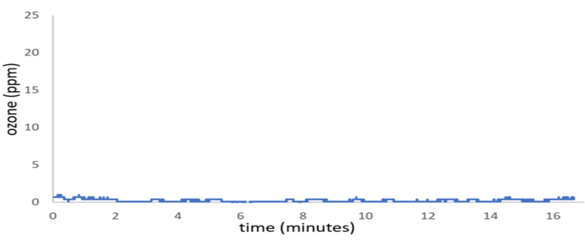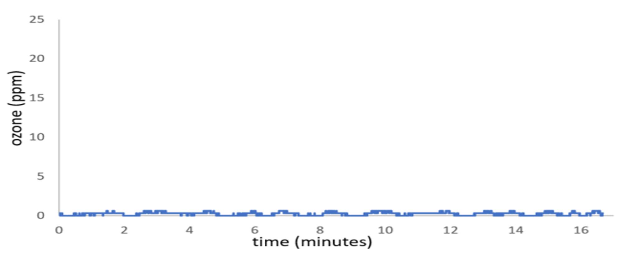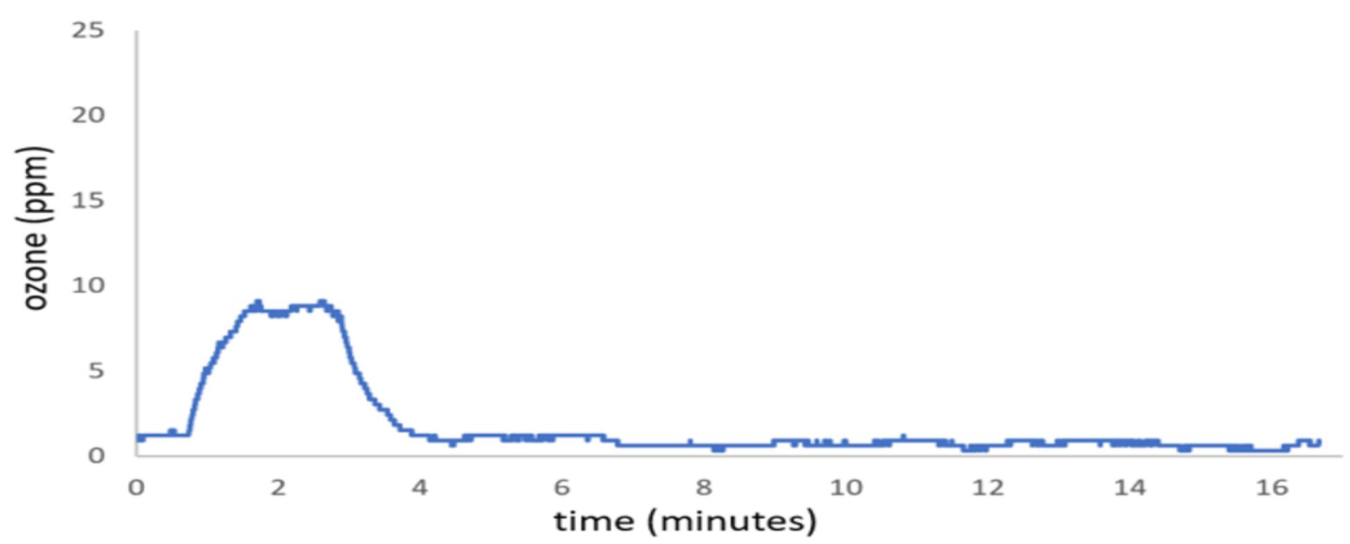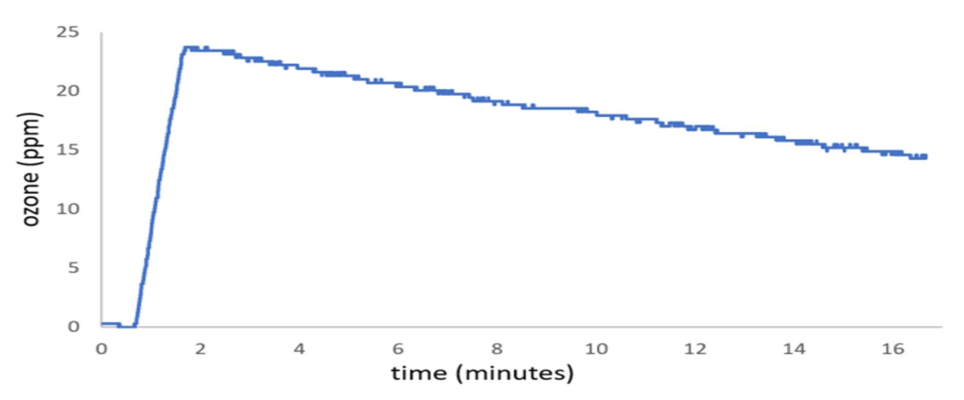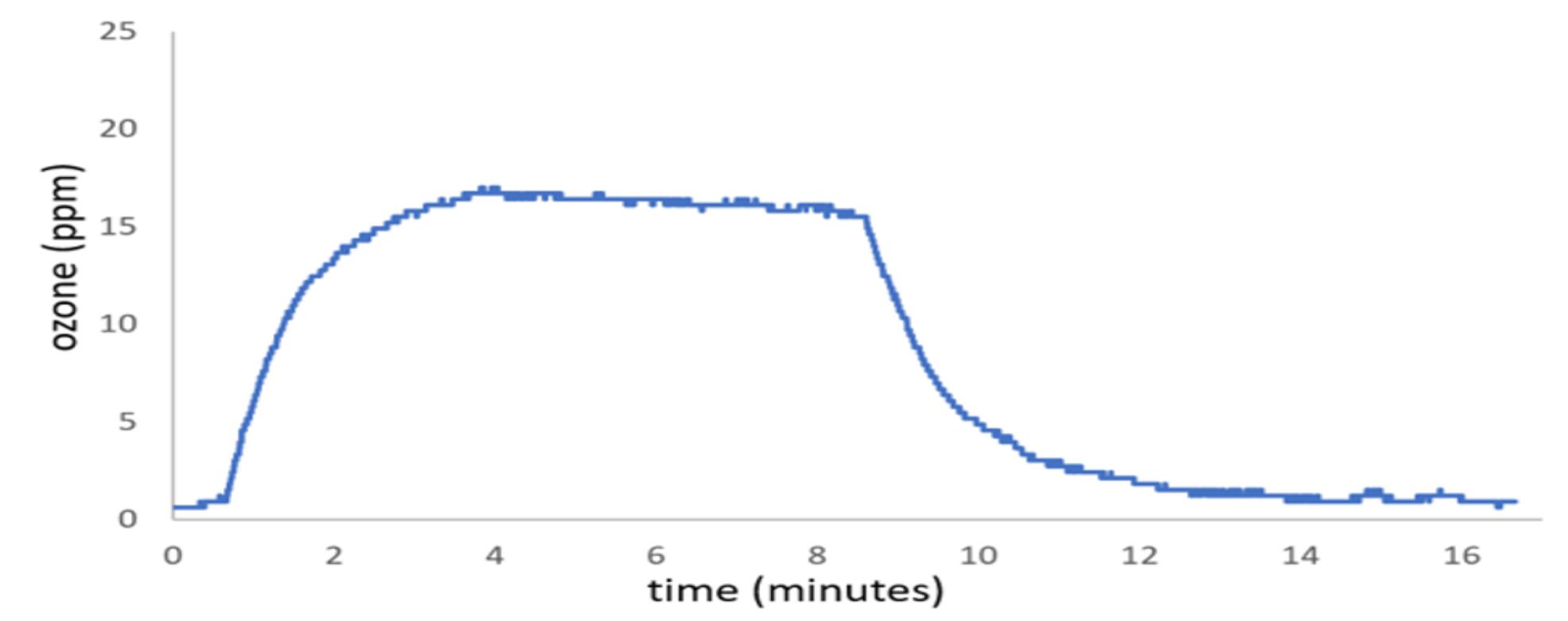 圖1.在一個(gè)24L 儲物盒中,在充滿和衰減期間,臭氧濃度隨時(shí)間變化的過程,蓋緊蓋子,并使用指定的臭氧鼓泡器產(chǎn)生600 mg / hr的臭氧。打開發(fā)生器電源后,臭氧濃度立即開始上升,并線性上升至大約24 ppm的水平,此時(shí)關(guān)閉了臭氧發(fā)生器電源,并使臭氧濃度下降。請注意,該盒子是空的,除了臭氧傳感器和一個(gè)混合風(fēng)扇陣列已經(jīng)經(jīng)過大約10個(gè)臭氧充電周期。