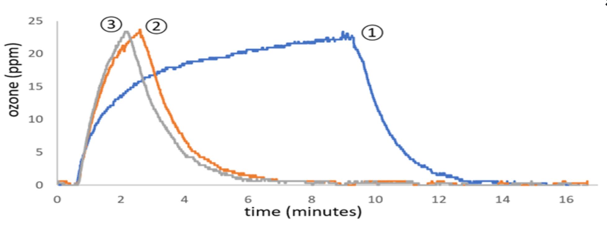 圖4.在盒子里裝臭氧淬火材料的影響。這將模擬一個(gè)使用骯臟和多孔材料的實(shí)際去污循環(huán),也演示了“壁效應(yīng)”,它減少臭氧的半衰期,因?yàn)樗c表面(壁)接觸。臭氧盒裝220mm x 80mm x 160mm小紙板箱2個(gè),總面積約為1300平方厘米,用過丁腈手套1副,用過N95口罩1副。將蓋子緊密貼合,使用指定為每小時(shí)產(chǎn)生600mg臭氧的臭氧鼓泡器進(jìn)行凈化循環(huán)。第一次臭氧濃度充滿和衰變循環(huán)如圖所示(1)。第一次去污循環(huán)耗時(shí)近10分鐘,達(dá)到 很大臭氧濃度20ppm以上。去污箱蓋被移開,剩余的臭氧被吹出。蓋被換掉,緊接著是第二次(2),然后是第三次(3)凈化循環(huán)。這些項(xiàng)目沒有被移除,每個(gè)循環(huán)緊接在前一個(gè)循環(huán)之后。注意,臭氧充電時(shí)間減少與每個(gè)循環(huán)。這一結(jié)果清楚地表明,骯臟的、受污染的和表面積大的材料 很初將對臭氧產(chǎn)生強(qiáng)大的猝滅作用。在第一次去污后,臭氧的猝滅作用大大降低,在隨后的去污循環(huán)中減少的程度要小得多。教訓(xùn):當(dāng)去污染的東西,或者很多東西的時(shí)候,去污染的時(shí)間要長,讓臭氧運(yùn)行的時(shí)間也要長,而且要考慮去污染不止一個(gè)周期。